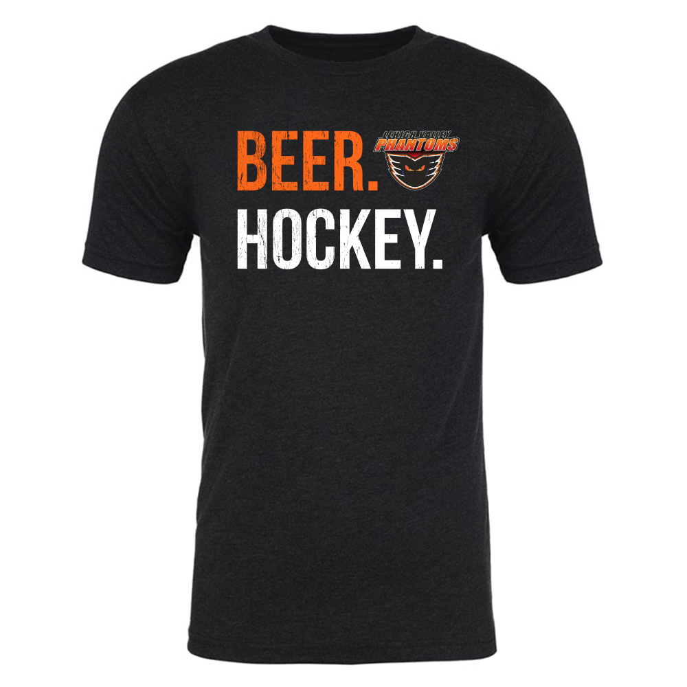 Our Phantoms Beer Hockey shirts are light, durable, and sure to be one of the softest shirts that you own. This short sleeve T Shirt includes our Phantoms team graphic printed on side chest. Everyone knows you root for the Phantoms with this Beer Hockey Lehigh Valley Phantoms T Shirt. Go Phantoms!