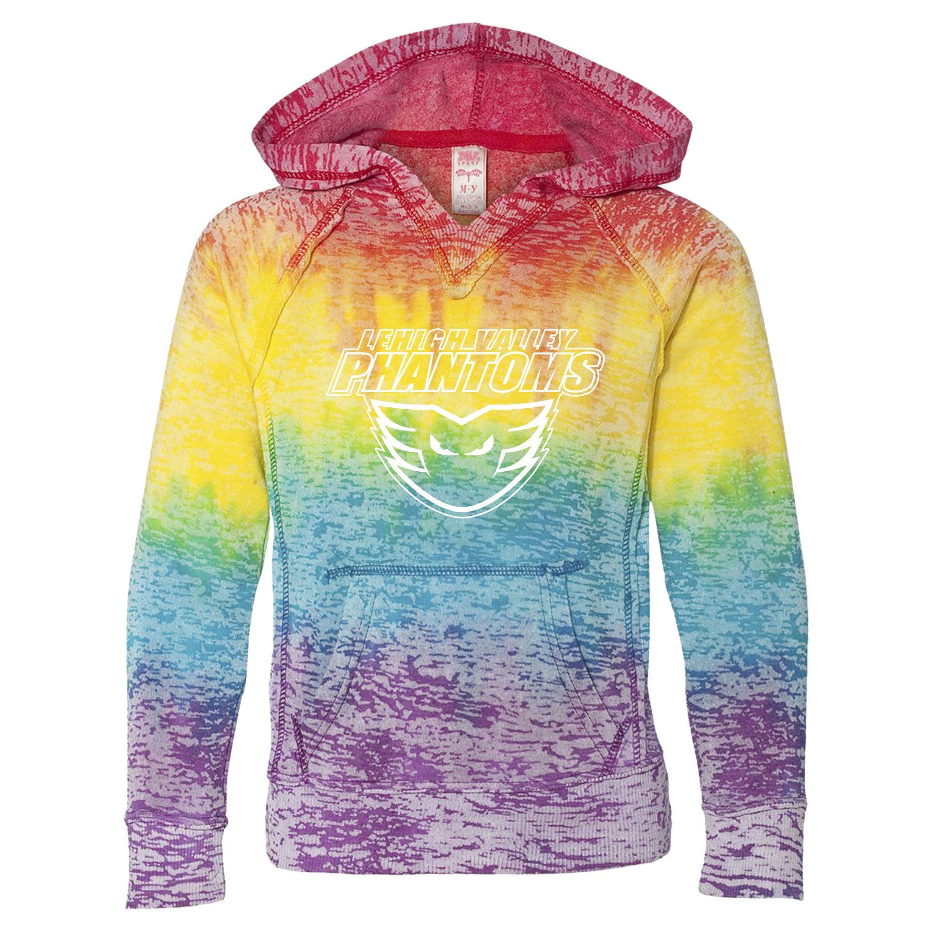 Let everyone know who your blossoming Phantoms fan who roots on Home Ice by grabbing this Rainbow Youth  Burnout hoodie. The midweight burnout ensures comfort while the rainbow colors brightens your kiddo's closet for years to come. Its vibrant color and Phantoms design showcases your youngster's undeniable love for the Phantoms.