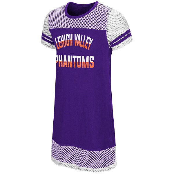 This sporty and spirited Phantoms dress is made to please with its bright purple fashion color, classic styling, and comfort-minded cut! Your little Phan girl will no doubt love the sequin Phantoms team name on the Front. The soft mesh details are fashionably displayed.