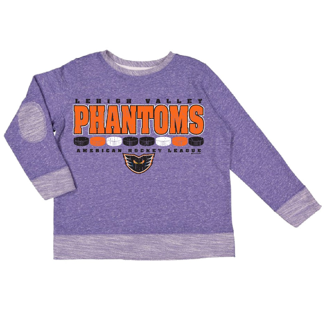 Ensure your young and growing Lehigh Valley Phan has what they need to keep warm & fashionable. Our Purple Puck Crew is a comfy pullover crew that features a fun play on puck graphics in colors of orange, black white and old school purple. Your kiddo will be reaching for this sweatshirt for every game day that's to come.