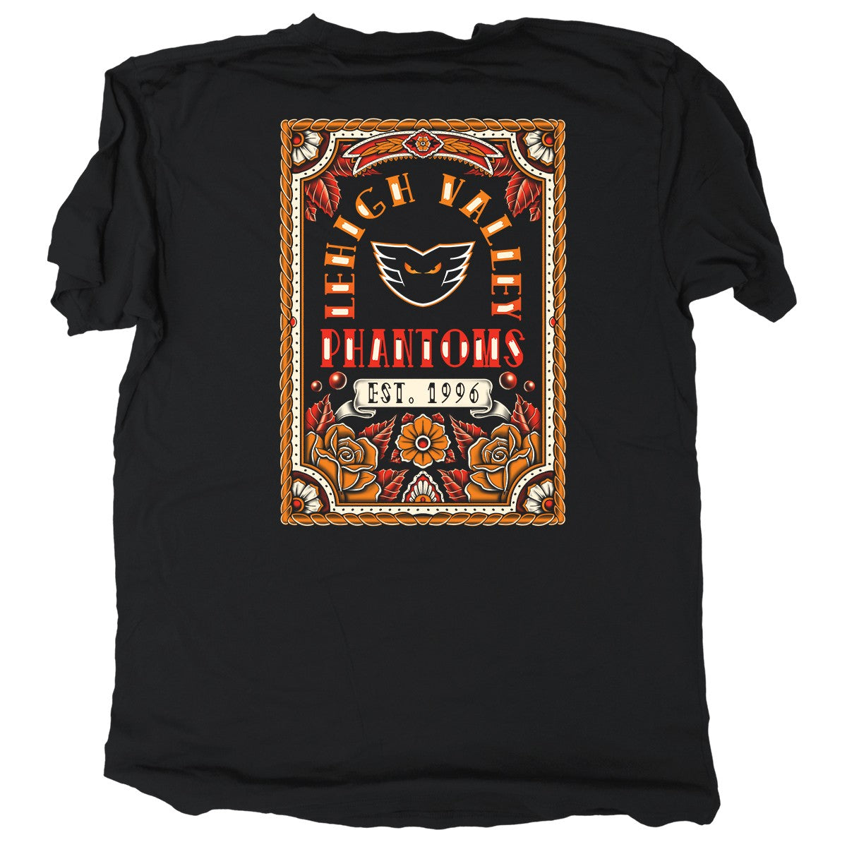 Lehigh Valley Phantoms on upper left chest in high contrast stenciled lettering. A tattoo design details the back with Lehigh Valley Phantoms design details & roses and leaves surround back design.