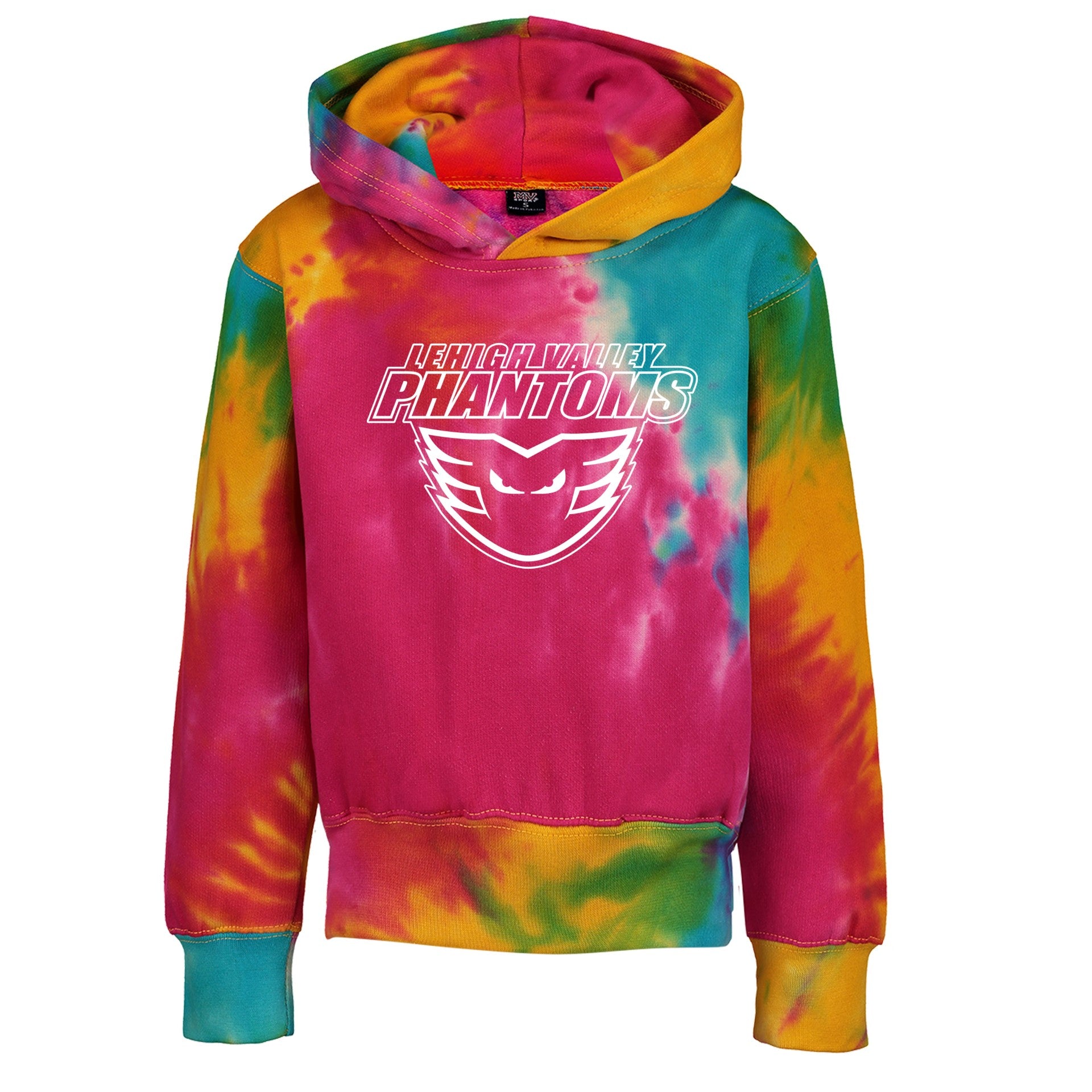 ur Lehigh Valley Phantoms- Color Splash tie dye hoodie is 100% cotton and is the perfect hoodie for watching the game and living life around the valley. The large Phantoms graphic mixed with the retro-inspired tie dye completes this hoodie, making it great Phan team apparel. Make sure to represent Phantoms with this comfortable hoodie.