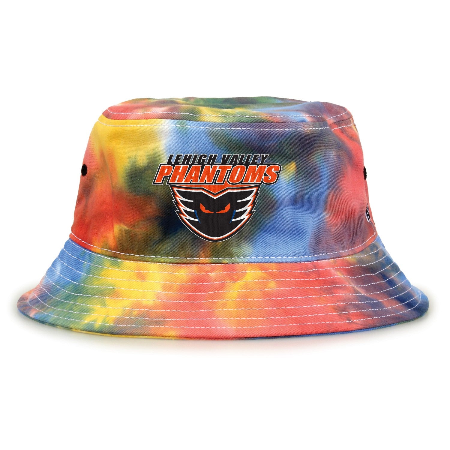 The Lehigh Valley Phantoms Tye Dye Bucket Cap designed for fans of the Phantoms hockey team The bucket cap has a brim that provides ample shade and protection from the sun, making it a great accessory for outdoor activities like tailgating, camping, or fishing. Keeping the head cool and comfortable during warm weather.